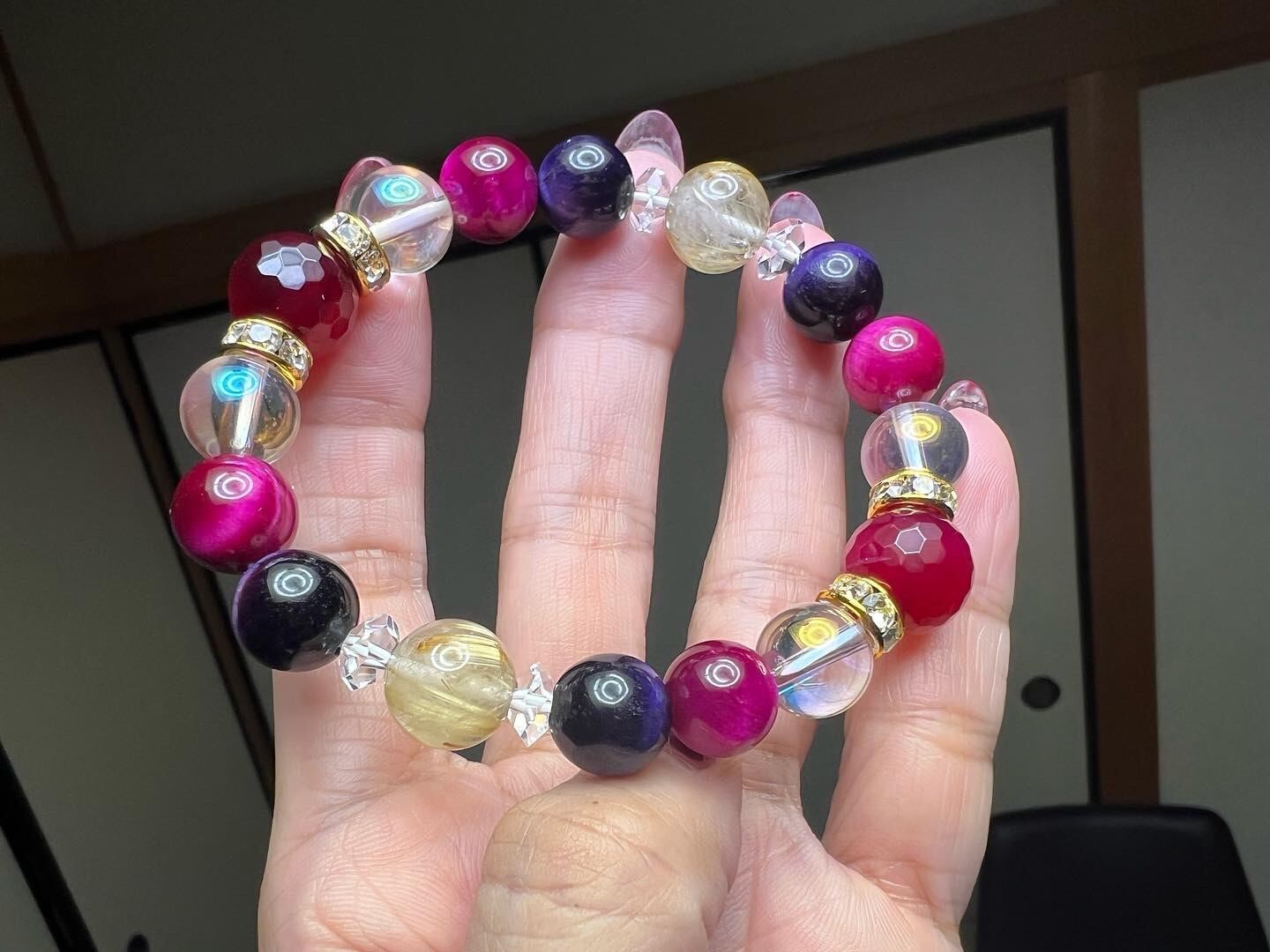 色が鮮やかなワインレッドカラーのアゲートにピンクタイガーアイ 、パープルタイガーアイ 、オーロラクリスタル、ゴールドルチルを組み合わせた金運、健康運アップブレスレットです。